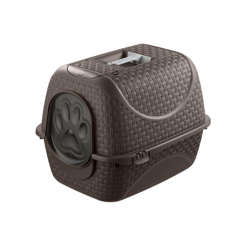 Pārnēsājama kaķu tualete ar vāku un durtiņām.