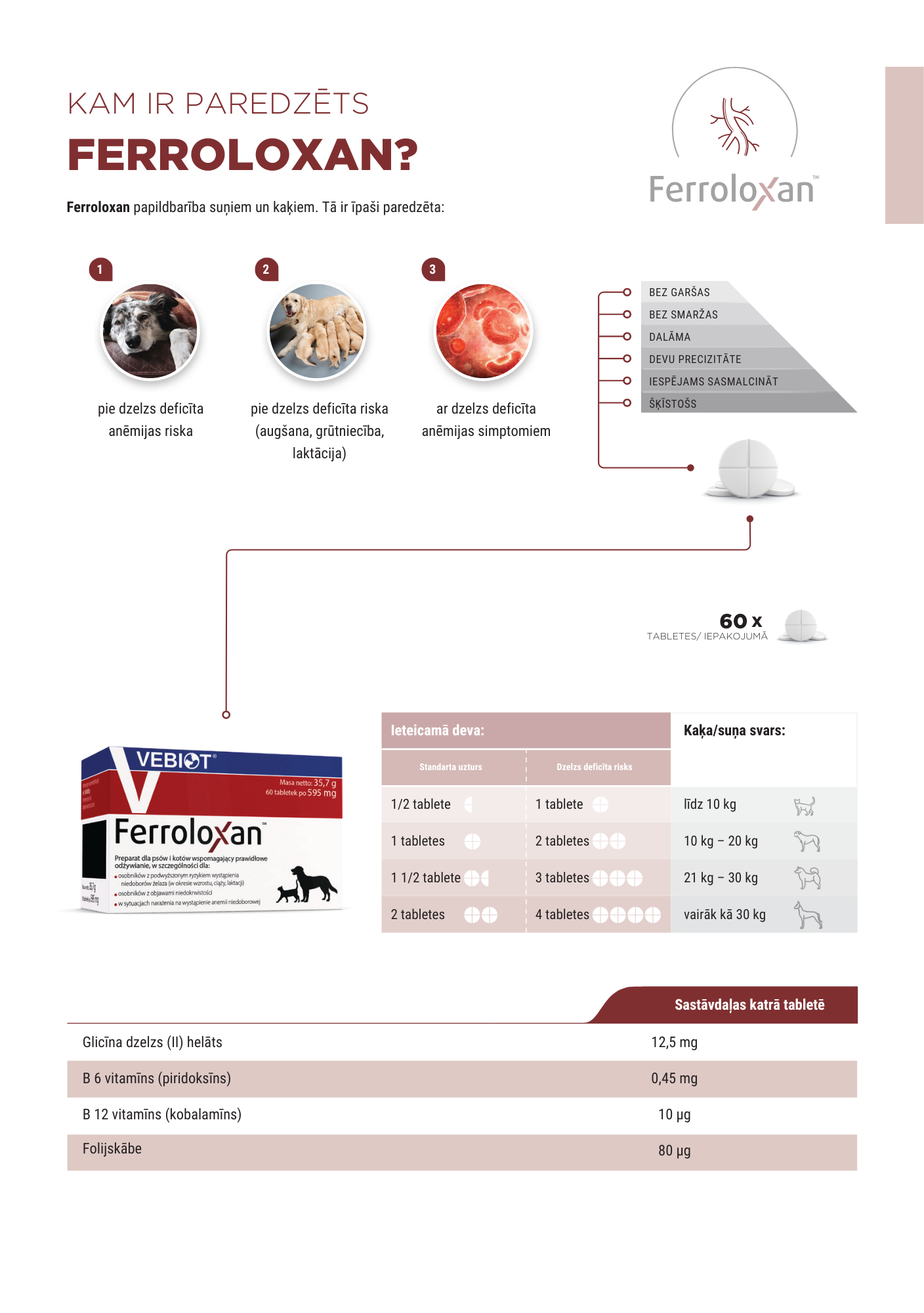 Lietošana: Ieteicamā Ferroloxan dienas deva ir atkarīga no dzīvnieka ķermeņa svara. Ja veterinārārsts nav ieteicis citādi, ievērojiet ieteicamo dienas devu.
